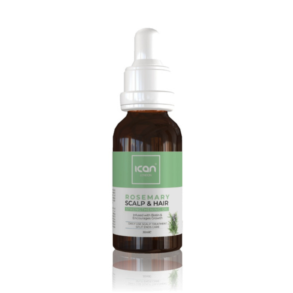 Revitalize your scalp and energize your hair with ICAN London Rosemary Scalp & Hair Strengthening Oil. Expertly formulated with a refreshing blend of rosemary extracts, this daily scalp treatment is infused with biotin to promote healthy hair growth, reduce breakage, and restore strength from root to tip.