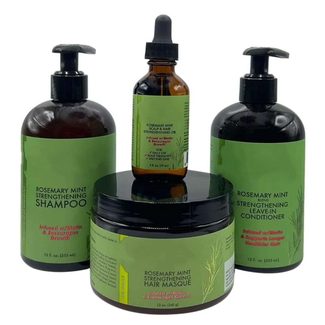 Rosemary Mint Organics Set Infused with Biotin 4 Pieces value bundle includes One Rosemary Mint Biotin Infused Hair Grow Shampoo, One Hair Strengthening Oil, One Hair Mask And One Hair Styling Creme.